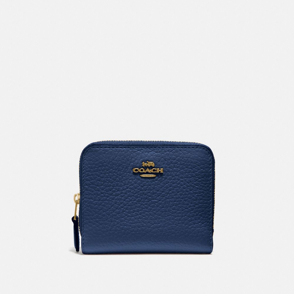 • Crafted of polished pebble leather, this compact billfold wallet features a convenient exterior zip pocket for coins, receipts, earbuds and other small essentials. It unsnaps to reveal eight card slots and a full-length bill compartment.