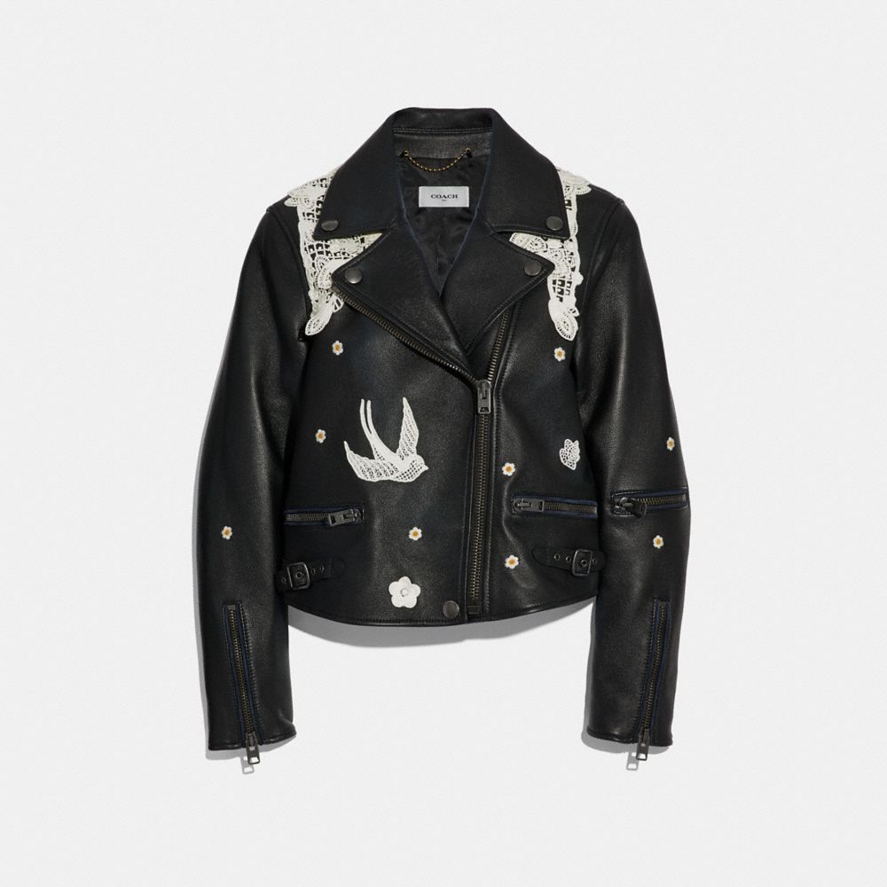 Tough yet tender, our moto vest is embellished with a smattering of daisy floral embroidery and lace appliqué. Crafted in soft lamb leather, it’s detailed with multiple zip pockets and a belted waist.