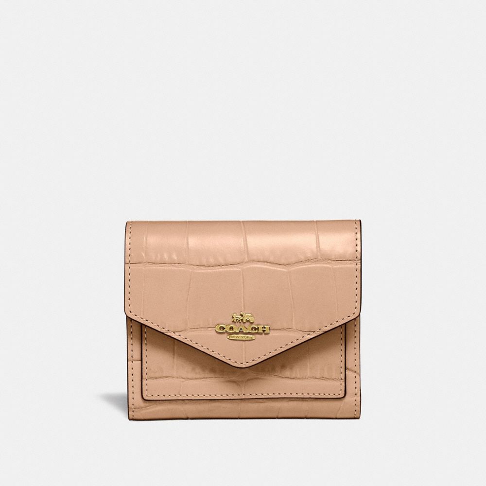 This compact wallet is crafted in distinctive crocodile-embossed leather. Secured by a snap closure, the trifold design is perfectly organized to hold cards, cash and receipts.