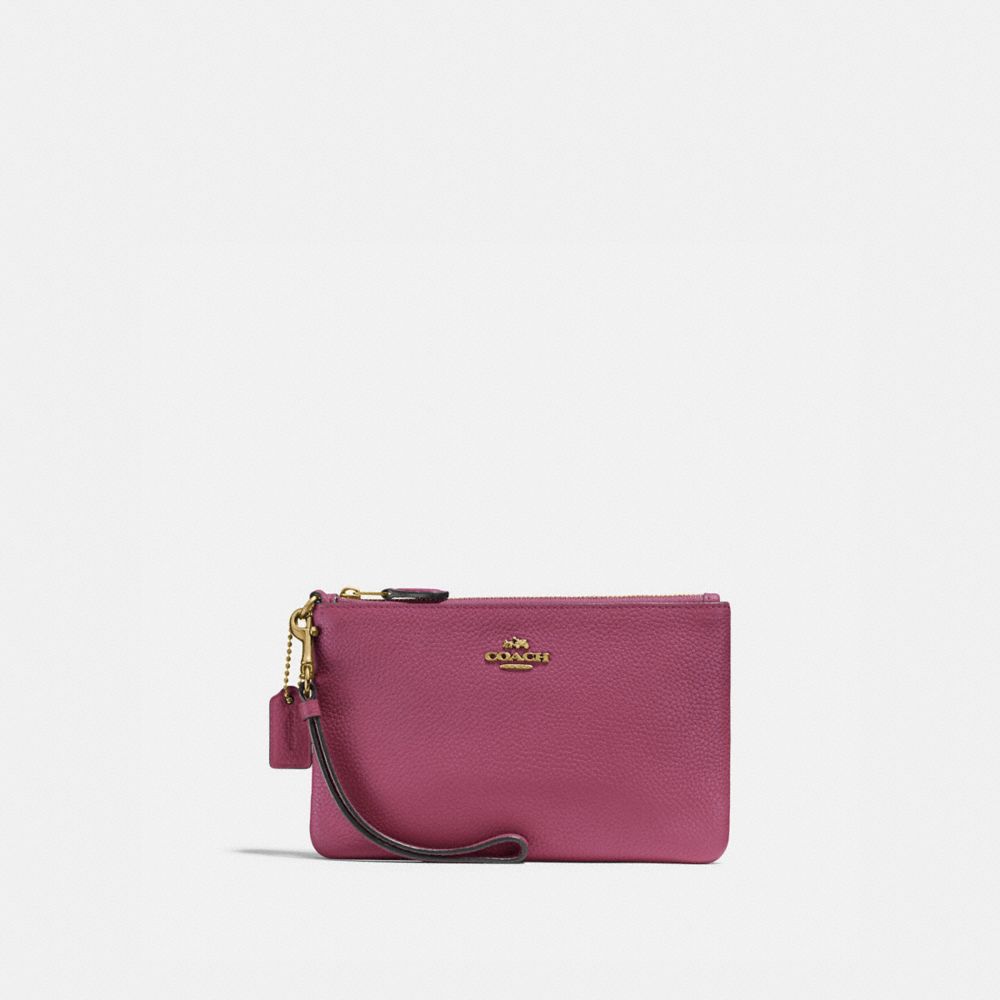 Crafted of polished pebble leather, this wristlet is perfectly sized for cards, cash and a phone. Wear it on your wrist or clip it inside a larger Coach bag.