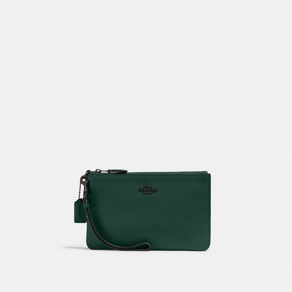 Crafted of polished pebble leather, this wristlet is perfectly sized for cards, cash and a phone. Wear it on your wrist or clip it inside a larger Coach bag.