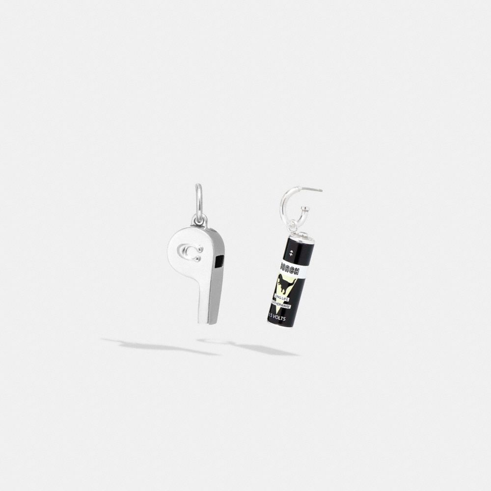 A perfectly mismatched pair—one earring features a whistle accented with our Signature, the other a Rexy print battery charm. The high voltage earrings are ready to make some noise.